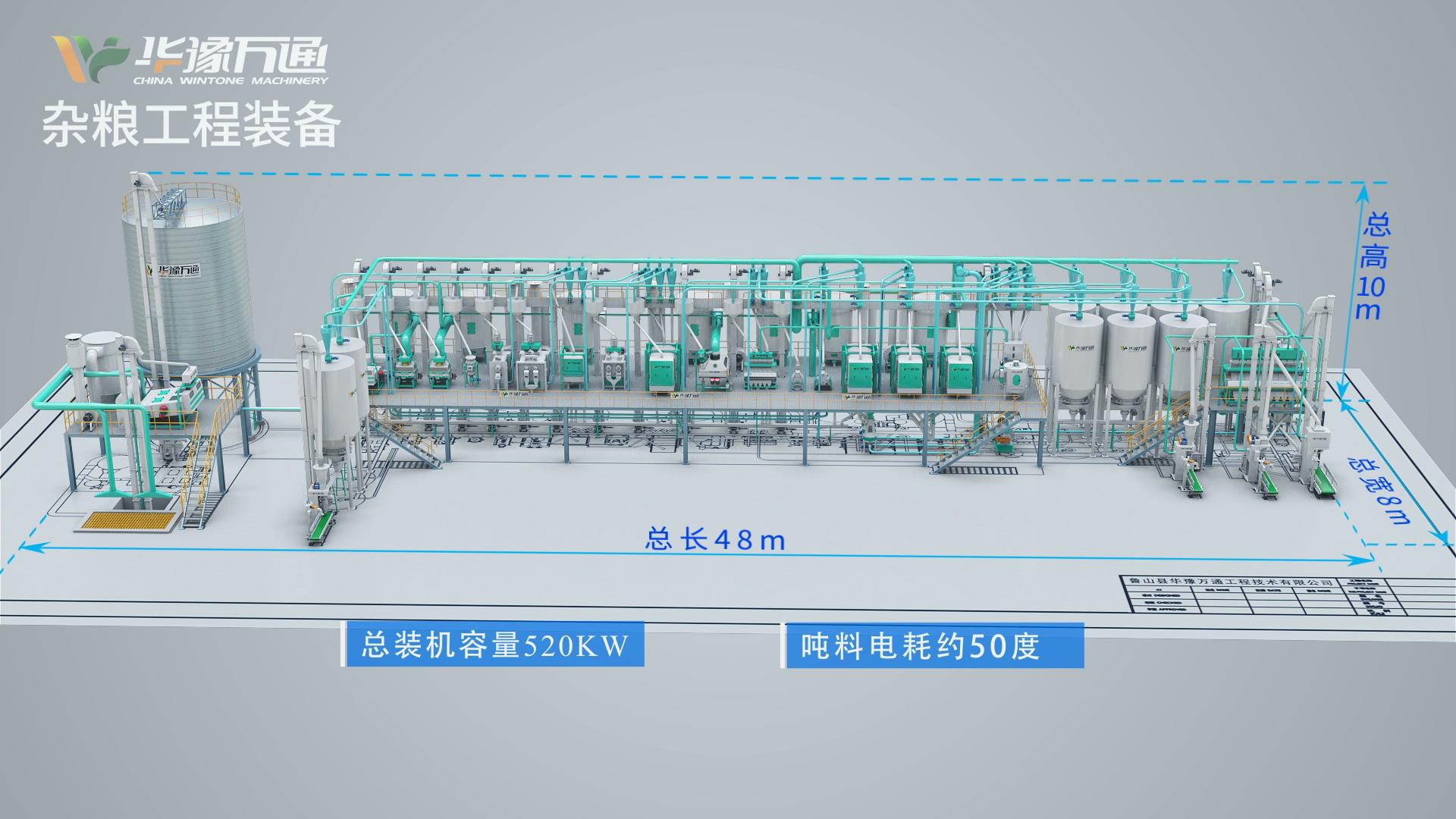 華豫萬通日加工150噸玉米制糝制粉創新工藝,設計為兩層平臺結構,三層設備布置,總長48m,寬8.0m,高10m,總裝機容量520kw,噸料電耗約50度,糝粉總收率≥65,糝內目測無皮、無黑星,粉內無麩皮,遠超國家標準。配備PLC智能化控制,可實現智慧化,數字化,可視化,無紙化生產。