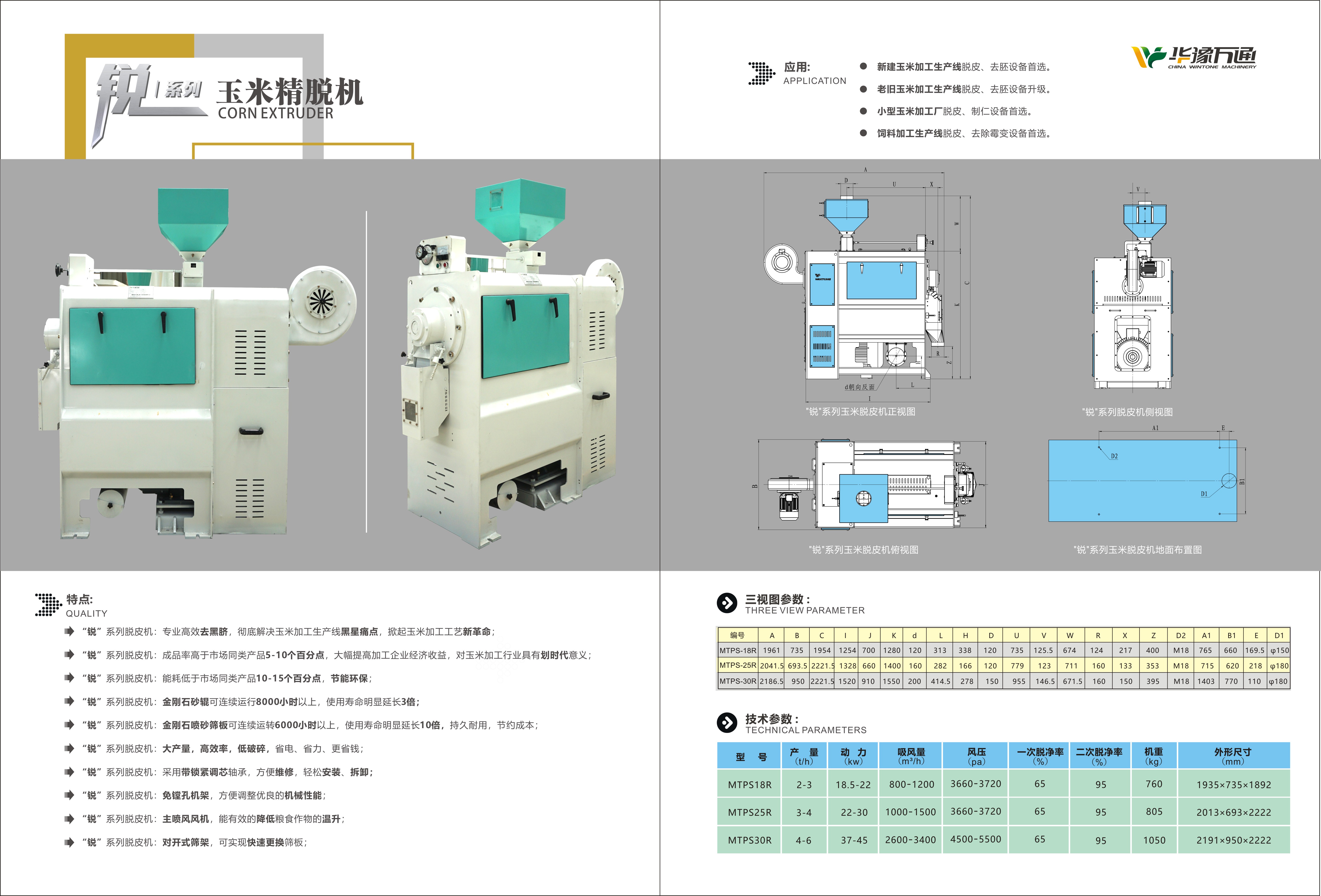 機器概述: 華豫萬通“銳‘系列脫皮機,摒棄傳統(tǒng)脫皮機“碾磨”的加工方式,采用“干式切削剝”技術(shù),可實現(xiàn)對玉米胚乳的分層精細切削剝離及胚芽的一次性剝除,從而達到對脫皮物料的很小破碎率和很佳脫皮效果。一次脫凈率60%,二次脫凈率達95%以上。 同時,相對傳統(tǒng)脫皮機,同樣功率, 產(chǎn)量提升1.5-2倍,節(jié)能降耗,迅速提升玉米加工企業(yè)利潤點。同樣的產(chǎn)量比效果,同樣的效果比能耗。 機器應用: *新建玉米加工生產(chǎn)線脫皮、去胚設備。 *老舊玉米加工生產(chǎn)線脫皮、去胚設備升級。 *小型玉米加工廠脫皮、制仁設備。 *飼料加工生產(chǎn)線脫皮、去除霉變及粗纖維設備。 機器圖片及參數(shù): 機器特點: “銳”系列脫皮機:專業(yè)高效去黑臍,解決玉米加工生產(chǎn)線黑星痛點,掀起玉米加工工藝新潮流; “銳”系列脫皮機:成品率高于市場同類產(chǎn)品5-10個百分點,大幅提高加工企業(yè)經(jīng)濟收益,對玉米加工行業(yè)具有意義重大; “銳”系列脫皮機:能耗低于市場同類產(chǎn)品10-15個百分點,節(jié)能環(huán)保; “銳”系列脫皮機:金剛石砂輥可連續(xù)運行8000小時以上,使用壽命明顯延長3倍; “銳”系列脫皮機:金剛石噴砂篩板可連續(xù)運轉(zhuǎn)6000小時以上,使用壽命明顯延長10倍,持久耐用,節(jié)約成本;“銳”系列脫皮機:大產(chǎn)量,低破碎,省電、省力、更省錢; “銳”系列脫皮機:采用帶鎖緊調(diào)心軸承,方便維修,輕松安裝、拆卸; “銳”系列脫皮機:免鏜孔機架,方便調(diào)整出優(yōu)良的機械性能; “銳”系列脫皮機:主軸噴風風機,能有效的降低糧食作物的溫升; “銳”系列脫皮機:對開式篩架,可實現(xiàn)快速更換篩板; 產(chǎn)成品展示: 更多糧食加工設備:歡迎咨詢?nèi)A豫萬通 :0371-86635901