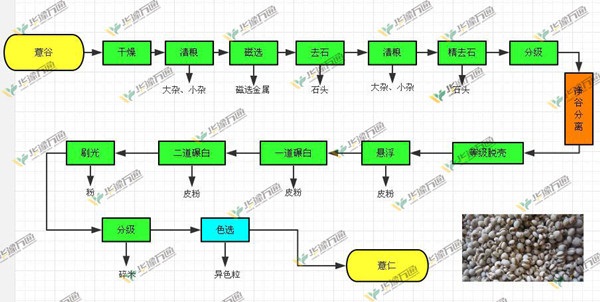 魯山縣華豫萬通工程技術有限公司對薏米技術工藝進行系列化開發,研制的薏米加工技術,脫殼率高,不破碎,加工動耗小,成功應用與多個薏米加工企業等。薏米加工工藝藝主要包括:清理→脫殼→碾白→色選→分級→包裝等多個工段。