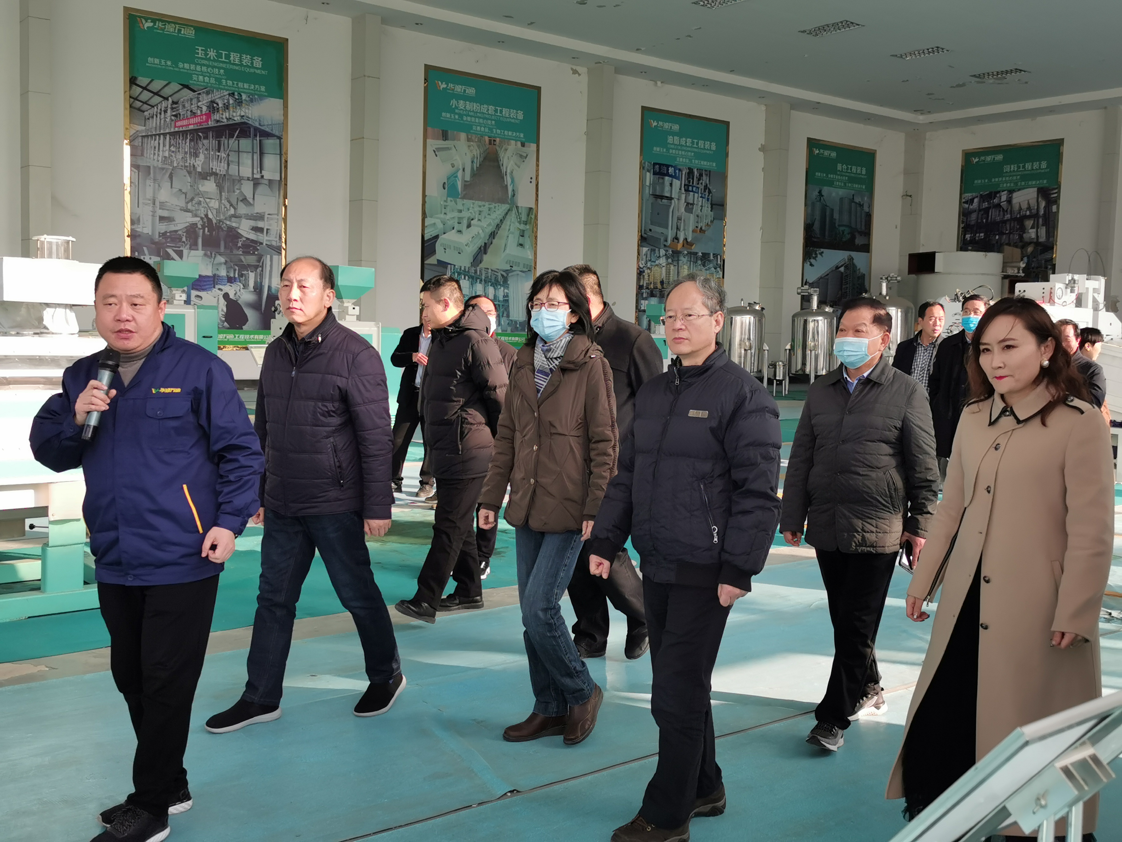 公司沈萌萌女士首先為調研團講解了公司五谷鮮湯智能售賣機,從產品性能,設計理念到市場應用,進行了專題匯報。王副主任就目前產品的技術創新提升提出建議和希望。在公司展廳內,公司李建春先生就公司產品發展歷程和各款樣機,深入淺出的和調研團進行了分享。在華豫萬通的暢銷產品--玉米脫皮機、智能谷物除霉減菌機前,調研團駐足觀看。走進中試車間,調研團觀摩正在試機的牡丹籽脫殼機,王卿卿工程師講解了設備的產能,用途,原理,與調研團進行了熱烈的互動交流。調研團領導對華豫萬通在糧機行業的創新和執著表示贊許。